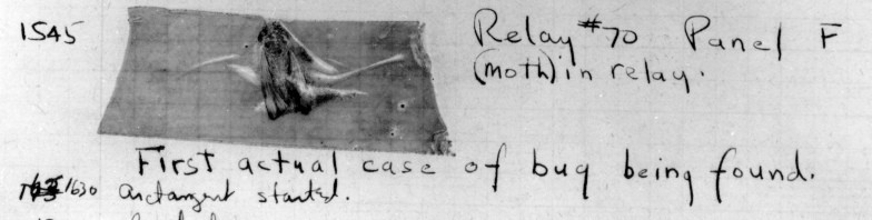 The text of the log entry (from September 9, 1947), reads “1545 Relay #70 Panel F (moth) in relay. First actual case of bug being found”. This wording establishes that the term was already in use at the time in its current specific sense — and Hopper herself reports that the term bug was regularly applied to problems in radar electronics during WWII.